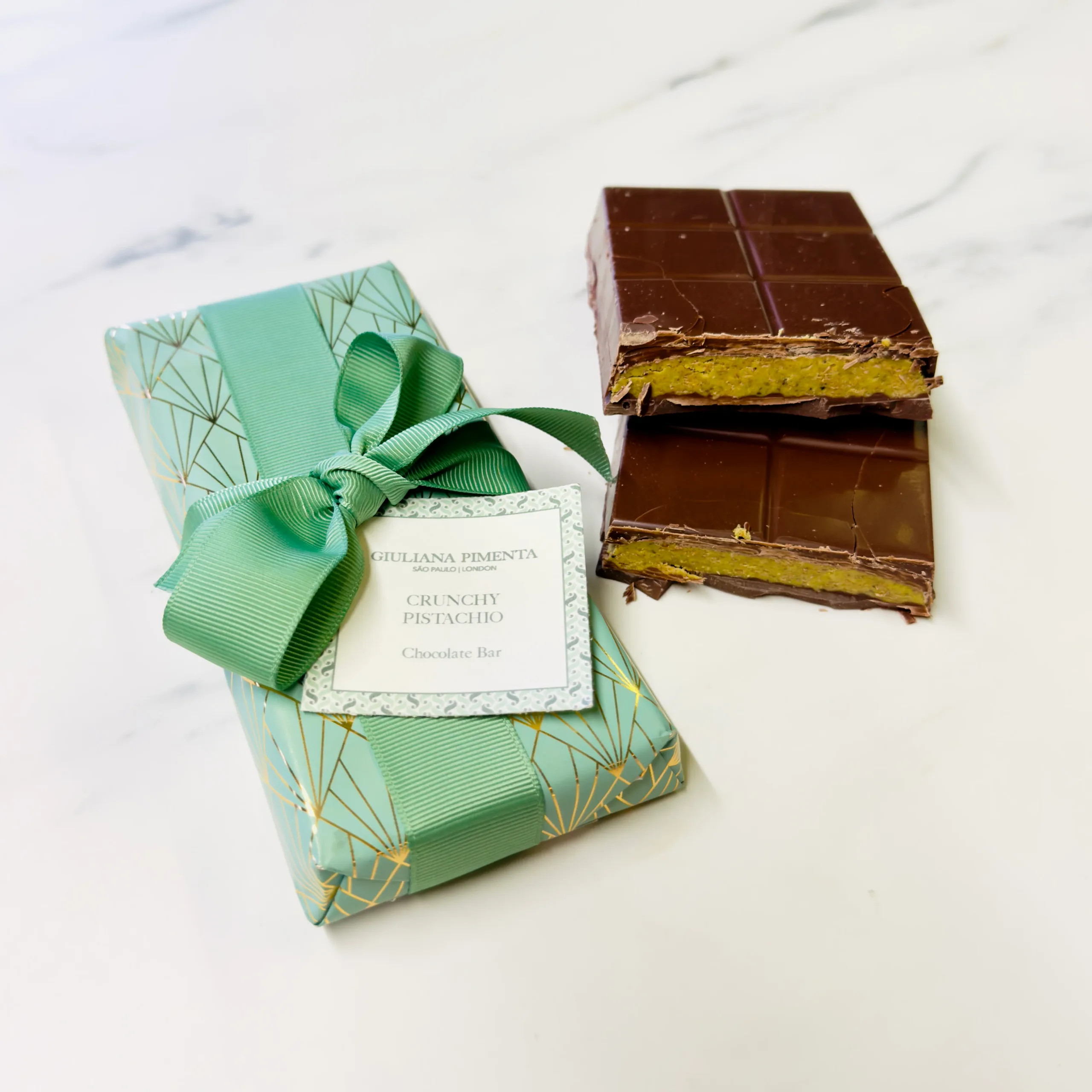 Experience the perfect harmony of textures and flavours in our Crunchy Pistachio Chocolate Bar. Made with rich 41% milk chocolate and lavishly filled with crunchy pistachio ganache, crafted from real roasted pistachios and caramelised wafer for depth, crunch and authenticity.