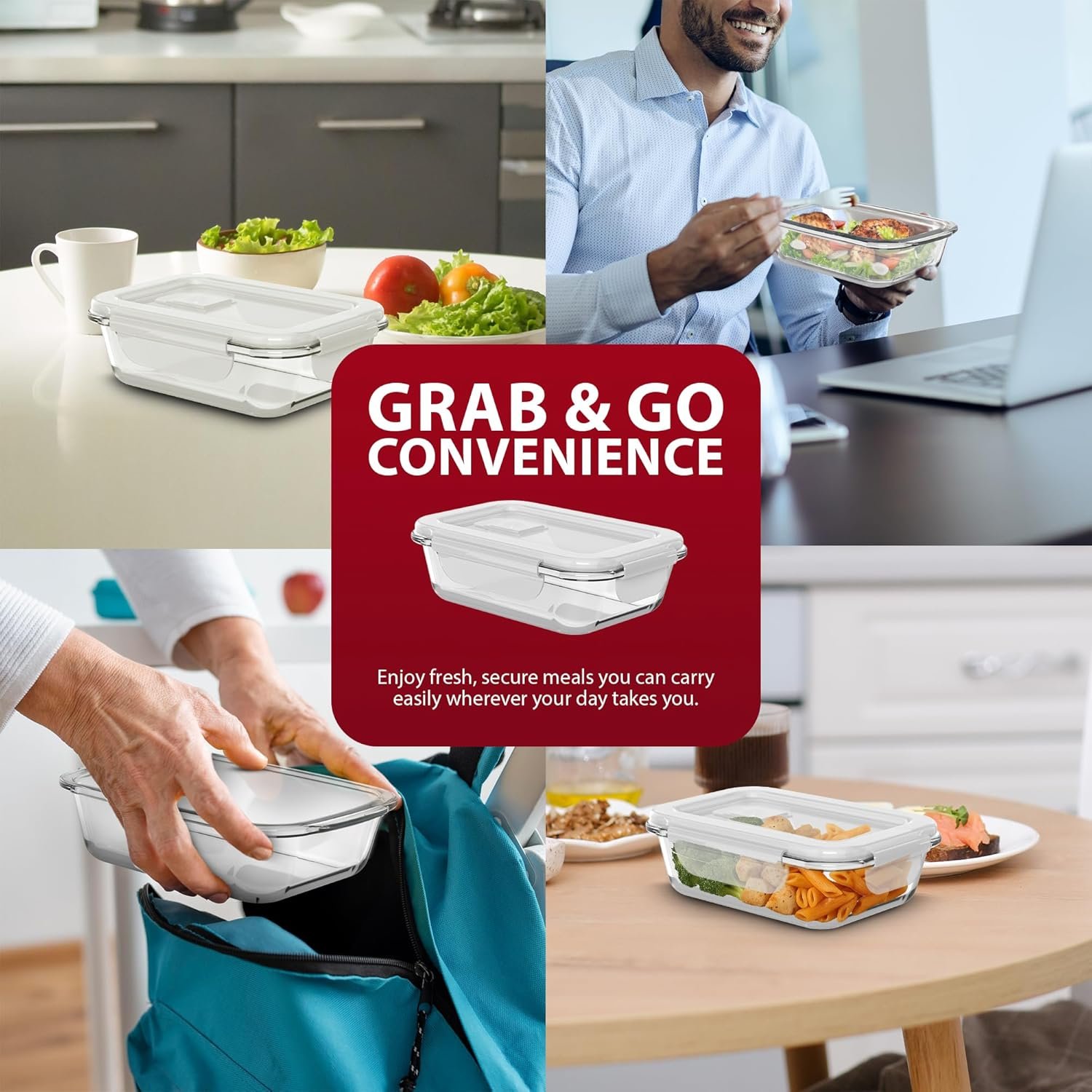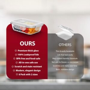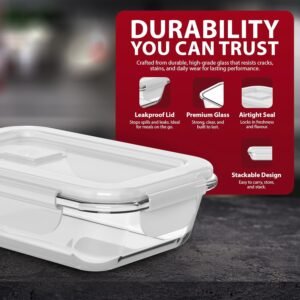 • LEAKPROOF AIRTIGHT LIDS FOR MAXIMUM FRESHNESS – Each container features a secure snap-lock lid and silicone seal to keep contents fresh and prevent leaks or spills. These glass storage containers with lids are perfect for both home use and on-the-go lifestyles.