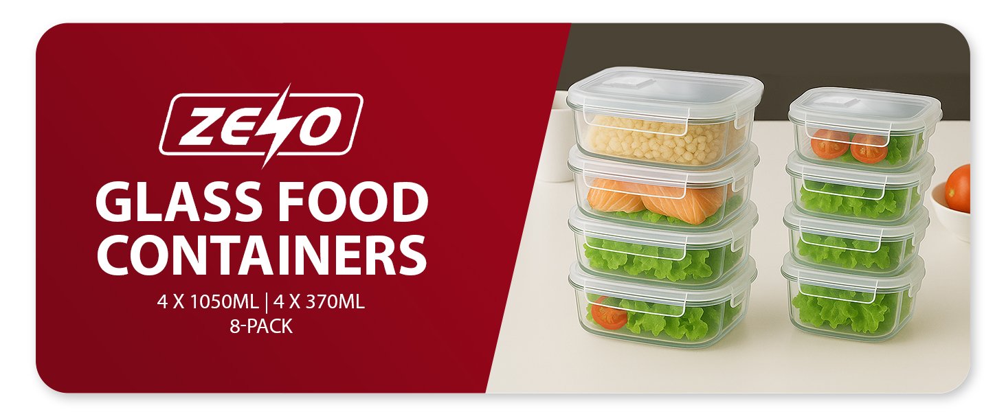 ZENO Glass Containers with Lids 8 Pack | Meal Prep Containers | Glass Food Container with Lid, Airtight Seal, Leakproof Lid | Dishwasher Safe | Freezer & Microwave Safe | 4 X 1050ml + 4 X 370ml